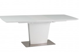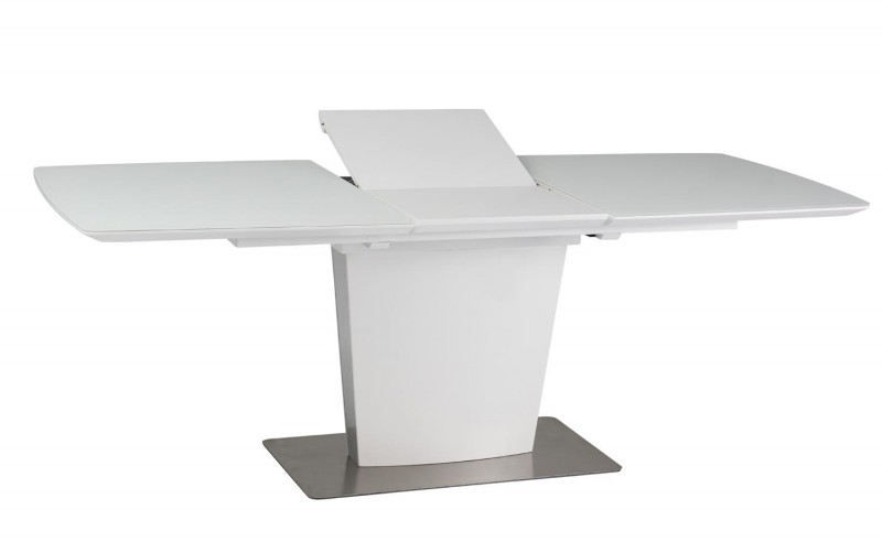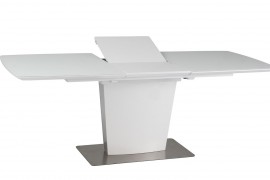 Blat wykonany został ze szkła hartowanego zestawionego z trwałym MDF, natomiast podstawa to stal szczotkowana utrzymana w białym macie. Na aranżacji stół prezentowany jest z krzesłami H-676.