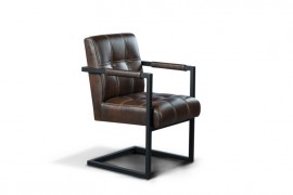 Wygodny fotel na metalowym stelażu malowanym proszkowo na czarny mat. Siedzisko i podłokietniki pokryte brązową ekoskróą.