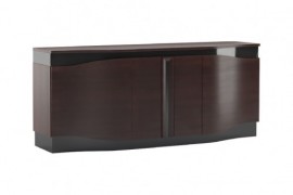 Komoda o frontach z litego drewna, w okleinie z czereśni amerykańskiej zachwyca połączeniem mebla klasycznego z nowoczesnością. Wykonane fale dodają kolekcji lekkości, natomiast wybarwienie venge z wstawkami w lśniącej lakierowanej czerni nadają szlachetności i elegancji. Mebel nadaje się do nowoczesnych jak i klasycznych wnętrz. Czworo drzwiczek zapewnia łatwy dostęp i dobre wykorzystanie przestrzeni.