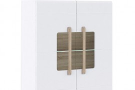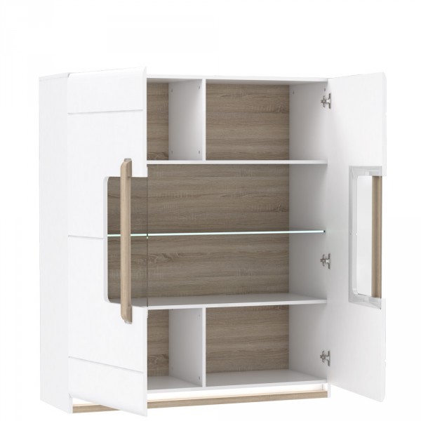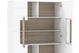 - Wnętrze mebla oraz uchwyty w formie ozdobnych listew wykonane zostały w kontrastującym dekorze Dąb Sonoma