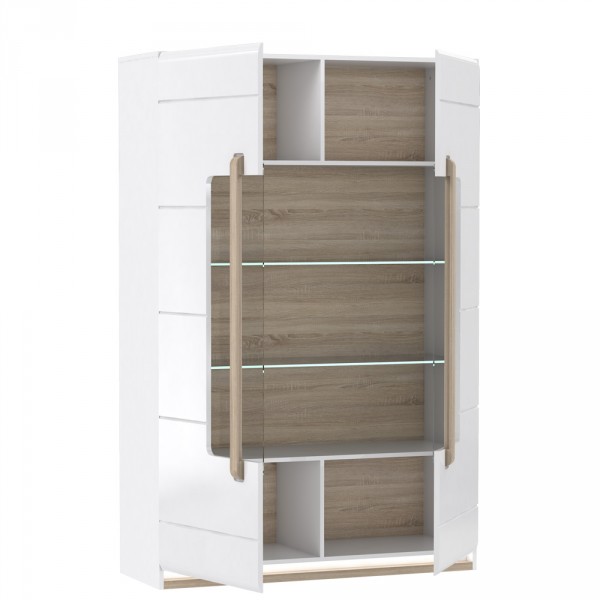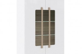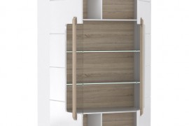 - Wnętrze witryny oraz uchwyty w formie listew wykonano w kontrastowym dekorze Dąb Sonoma
