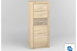 Komoda składa się z części jednodrzwiowej oraz dwóch szuflad. Część dolna to dwie komory oddzielone od siebie półką wykonaną z wysokiej jakości płyty laminowanej. Castel to kolekcja wykonana z płyty laminowanej w bardzo modnym kolorze jasnego Dębu sonoma, który został połączony z ryflowaną wstawką MDF w kolorze Dąb sonoma truflowa. Szerokie, zaokrąglone ramki MDF okalające korpus akcentują to, co w tym projekcie najważniejsze-solidność z jednoczesną delikatnością, która sprawdzi się w każdym domowym wnętrzu. Elegancji meblom dodaje trzypunktowe oświetlenie LED oraz uchwyty w kolorze szampańskim, stanowiące idealne wykończenie tej pełnej charakteru kolekcji.