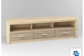 Szafka składa się z trzech szuflad oraz trzech otwartych komór. Castel to kolekcja wykonana z płyty laminowanej w bardzo modnym kolorze jasnego Dębu sonoma, który został połączony z ryflowaną wstawką MDF w kolorze Dąb sonoma truflowa. Szerokie, zaokrąglone ramki MDF okalające korpus akcentują to, co w tym projekcie najważniejsze-solidność z jednoczesną delikatnością, która sprawdzi się w każdym domowym wnętrzu. Elegancji meblom dodaje trzypunktowe oświetlenie LED oraz uchwyty w kolorze szampańskim, stanowiące idealne wykończenie tej pełnej charakteru kolekcji.