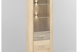 Witryna składa się z części dwudrzwiowej. Dolna część podzielona została na dwie dwie części, natomiast góra to trzy komory oddzielone ze sobą hartowanym szkłem. Castel to kolekcja wykonana z płyty laminowanej w bardzo modnym kolorze jasnego Dębu sonoma, który został połączony z ryflowaną wstawką MDF w kolorze Dąb sonoma truflowa. Szerokie, zaokrąglone ramki MDF okalające korpus akcentują to, co w tym projekcie najważniejsze-solidność z jednoczesną delikatnością, która sprawdzi się w każdym domowym wnętrzu. Elegancji meblom dodaje trzypunktowe oświetlenie LED oraz uchwyty w kolorze szampańskim, stanowiące idealne wykończenie tej pełnej charakteru kolekcji.