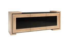 Kredens o frontach z litego drzewa, zachwyca elegancją i szlachetnością naturalnych słoi. Mebel nadaje się do nowoczesnych jak i klasycznych wnętrz. Charakterystyczne dla kolekcji masywne (drewniane) elementy boczne nadają oryginalnego designu. Czarny lacobel na froncie i górze kredensu podkreśla elegancje kolekcji.