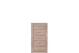 Komoda wysoka GRESS wyposażona jest w pięć pojemnych szuflad. Prosta forma przypadnie do gustu miłośnikom minimalizmu. Dostępna jest w dwóch wersjach kolorystycznych – dąb sonoma oraz wenge. Idealnie sprawdzi się w aranżacji pomieszczeń takich jak: pokój dzienny, salon, przedpokój, sypialnia, gabinet lub pokój młodzieżowy. Elegancja jasnego dekoru oraz wyrazistość ryflowanych zdobień to charakterystyczny wyróżnik tej kolekcji mebli. Kolor tych mebli naturalnie łączy się z szeroką gamą barw farb oraz tapet jakie możemy zastosować na ścianach pomieszczeń.