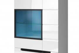 Witryna wisząca prawa Hektor marki Helvetia Wieruszów to solidny mebel, który będzie wspaniale prezentować się będzie na ścianie Twojego salonu lub jadalni. Jej urok tkwi w bardzo nowoczesnym wyglądzie - połyskującej bieli czy segmentowej formie frontu z efektownym frezowaniem pełniącym rolę uchwytów. Kolejnym detalem, który wpływa na perfekcyjną prezencję witryny wiszącej prawej z kolekcji Hektor jest oszklona bardzo trwałym szkłem węglowym część, umiejscowiona w czarnej ramce oraz podkreślona energooszczędnym oświetleniem LED typu Quatro za dodatkową opłatą. Mebel ten będzie doskonałą inwestycją na lata również dlatego, że jest wykonany z płyty laminowanej oraz MDF, które są wytrzymałe i odporne na działanie wielu czynników zewnętrznych.