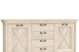 W komodzie pomieścisz wszystko to, co potrzeba a jednocześnie urozmaicisz wnętrze salonu czy jadalni meblem w niezwykle modnym, prowansalskim stylu. Jej dwudrzwiowy front został okraszony efektownymi szprosami, za to cztery szuflady w środkowej części to idealne miejsce na drobiazgi. Masywne cokoły i wieńce dodają wyrazistości i podkreślają solidność wykonania. Ergonomiczne, postarzane uchwyty to gwarancja wygody użytkowania mebla na co dzień. Wyjątkowe wybarwienie pinia biała rozjaśni wnętrze, doda mu uroku i wdzięku.
