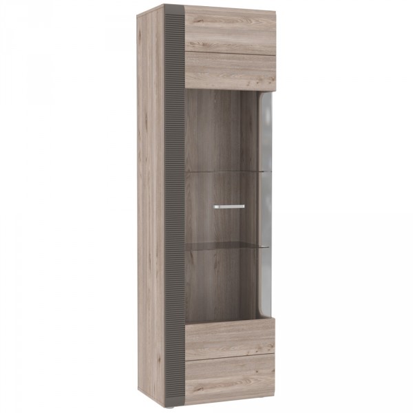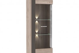 Witryna składa się z części jedno drzwiowej częściowo przeszklonej i otwieranej w lewo. Wewnątrz za drzwiami posiada dwie szklane półki i dwie półki z płyty meblowej. Locarno to kolekcja nowoczesnych mebli, które świetnie sprawdzą się w aranżacji pokoju dziennego lub salonu. Cechą charakterystyczną mebli z tej kolekcji są zaokrąglenia w górnej i dolnej części frontów oraz pionowe listwy ozdobne w szarym kolorze, które świetnie kontrastują z jasnym dekorem Dębu Nelson. Całość dopełniają metalowe uchwyty w kolorze chromu.