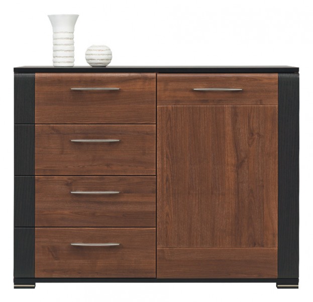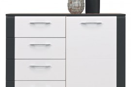 Piękna, nowoczesna i uniwersalna komoda złożona z szuflad i półek, którą dopasujesz do każdego wnętrza. Połączenie orzecha z kolorem wenge oraz bieli z sonomą będzie pasowało do większości pomieszczeń.