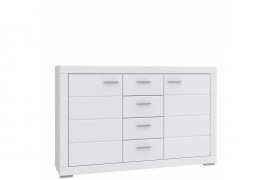 Biała komoda z szafkami oraz czterema szufladami. Fronty, osadzone w pogrubionej ramie okalającej, ozdobione zostały poziomymi frezowaniami. Krawędzie komody są zaokrąglone i zabezpieczone obrzeżami ABS. Komoda ma prostą, geometryczną budowę charakterystyczną dla całej kolekcji mebli młodzieżowych SNOW.