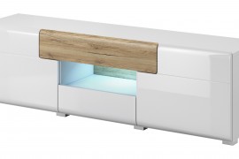 Mała szafka RTV Toledo to mebel minimalistyczny, prosty i funkcjonalny. Wykonana w modnym białym wybarwieniu z elementami w przyjemnym dekorze Dębu Sanremo. Mebel posiada otwartą wnękę, z możliwością podświetlenia LED. Ustawisz w niej dekoder lub odtwarzacz. Oprócz tego szafka została wyposażona w dwoje bocznych drzwiczek i dwie szuflady - dolną oraz górną. Tradycyjne uchwyty zastąpiono wygodnymi podchwytami, a geometrycznym kształtom mebla subtelności dodają delikatne frezowania frontów i ich zaoblone krawędzie.