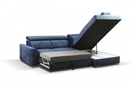 Nowoczesny narożnik wyposażony w ruchome zagłówki oraz niezwykle wygodną funkcję spania (bonell) i pojemnik na pościel.Komfort zapewnia podwójne sprężynownaie, pianka HR oraz pasy tapicerskie.