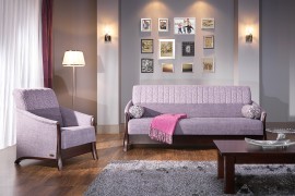 Subtelne detale i ponadczasowe rozwiązania stanowią o wyjątkowości tych mebli. Wzorzyste, pikowane pionowymi liniami fragmenty tapicerki są pozytywnym akcentem i upodabniają się do zagłówków. Drewniane elementy podkreślają kształty mebli. A ciemny odcień drewna współgra z jasna tkanina obiciową dodając całości elegancji i smaku.