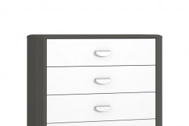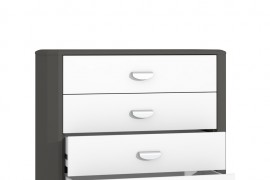 Dzięki 4 pakownym szufladom komoda Hey marki Forte będzie niezwykle funkcjonalnym elementem w pokoju dziecięco-młodzieżowym. W każdej z szuflad można wygodnie poukładać rzeczy - swetry, podkoszulki, książki oraz zabawki. W swojej stylistyce komoda nawiązuje do aktualnych trendów, czyli minimalizmu oraz stonowanej kolorystyki. Właśnie dzięki połączeniu modnej bieli z ciemniejszym dekorem wolframu mebel wygląda wyśmienicie. Charakterystyczne, ścięte krawędzie urozmaicają kształt, a zaokrąglone uchwyty zapewniają wygodne i bezpieczne użytkowanie. Komoda Hey z pewnością przyda się Twojemu dziecku na wszystkie jego skarby!
