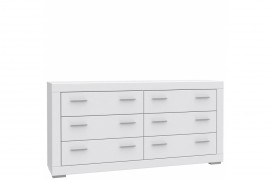 Szeroka, biała komoda z sześcioma szufladami. Mebel pochodzi z kolekcji nowoczesnych mebli SNOW. Pogrubione elementy komody nadają jej masywności, co ciekawie komponuje się z jasną, subtelną kolorystyką mebla. Krawędzie komody są zabezpieczone obrzeżem ABS. Szuflady wyposażone zostały w system cichego domykania. Prosta forma metalowych uchwytów w kolorze chromu jest doskonałym uzupełnieniem stylistyki mebla. Zobacz inne komody