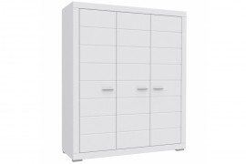 Pojemna szafa trzydrzwiowa w kolorze białym z powodzeniem wpisze się w różne aranżacje. Prosta forma mebla została otoczona pogrubioną ramą, a fronty ozdobione poziomymi frezowaniami. Biel świetnie komponuje się ze wszystkimi kolorami, co daje nieskończone możliwości w tworzeniu własnych aranżacji. Srebrne uchwyty i nóżki idealnie komponują się z minimalistyczną stylistyką mebla i podkreślają jego nowoczesny charakter.