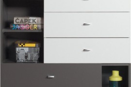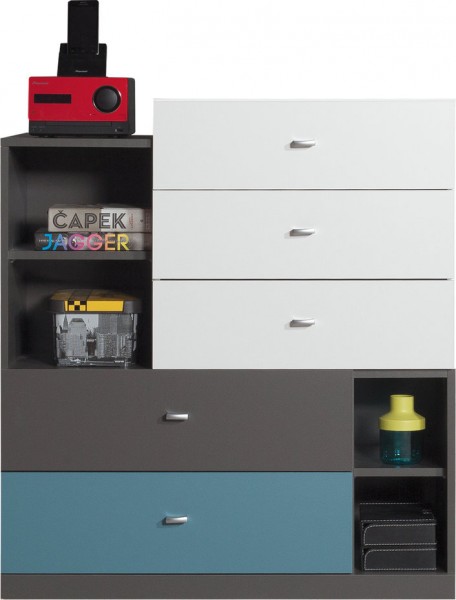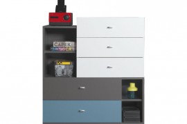 Komoda zaprojektowana z myślą o modnym i dobrze uporządkowanym pokoju młodzieżowym. Ten niezwykle funkcjonalny element składa się z 5 pojemnych szuflad - 3 mniejszych oraz 2 większych. Po przekątnej znajdują się otwarte wnęki wyposażone w półki. Designerski, kubistyczny kształt odzwierciedla trend minimalistyczny, który wiedzie prym w tym sezonie. Również kolorystyka łącząca biel, grafit oraz dekor atlantic doskonale wstrzela się w aktualne trendy. Komoda Tablo wykonana jest z płyty laminowanej wzmocnionej obrzeżem ABS, co sprawia, że będzie służyła nastolatkowi przez długi czas.