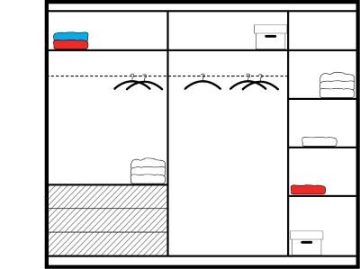 Pojemne wnętrze szafy zapewnia odpowiednią segregację ubrań wierzchnich, wizytowych, a także mniejszych elementów garderoby które można poukładać na licznych jej półkach.