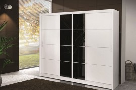Szafa jest wykonana z wysokiej jakości płyty laminowanej. Elementem ozdobnym szafy jest czarne szkło połysk.