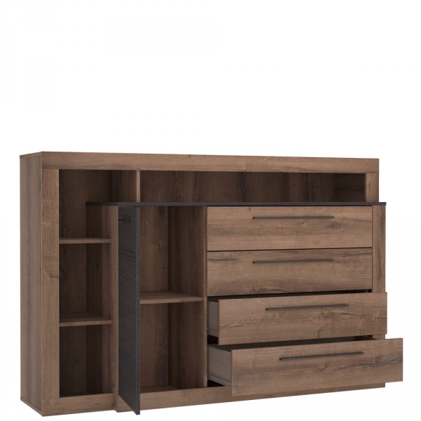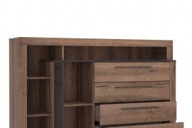 Duża komoda do sypialni, która ułatwi Ci funkcjonalne wyposażenie wnętrza. Oryginalna konstrukcja mebla pozwoli uzyskać wyjątkowy efekt. Połączenie kolorów dąb szlachetny i dąb czarny dodaje stylu. Dzięki szufladom z łatwością uporządkujesz wszystkie niezbędne przedmioty elementy garderoby czy pościel. Półki pozwalają dowolnie udekorować wnętrze i stworzyć niepowtarzalną atmosferę. Kolekcja Belvue wprowadzi do wnętrza klimat luksusu i napełni je elegancją.