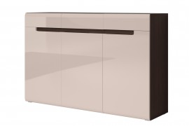 Z myślą o wygodnym porządkowaniu odzieży w sypialni powstała komoda Hektor, czyli produkt marki Helvetia Wieruszów. Jednak spełniając Twoje potrzeby, ma ona różnorodne zastosowania. W trzech szafkach i szufladach możesz posegregować garderobę, domowe akcesoria i dodatki a długi blat mebla wykorzystać jako miejsce do wyeksponowania pamiątek czy świeżych kwiatów. Zestawienie modnie wyglądających barw a więc przyjemnego piasku i klimatycznego wenge nada aranżacji nuty elegancji i przytulności. Pozioma, wcięta w strukturę efektownie połyskującego frontu linia to nowoczesna forma uchwytów. Dzięki nim komoda Hektor jest bardziej bezpieczniejsza i wygodniejsza w użytkowaniu.