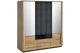 Szafa 3 D z kolekcji Maganda .Od zewnątrz środkowy segment wykończony tkaniną ,a pozostałe dwa lustrem. Od wewnątrz w środkowej części mieszczą się praktyczne półki ,natomiast w prawym i lewym segmencie drążek na wieszaki. Dolną część stanowią 3 szuflady oraz mniejsze szafki. Dostępna w dwóch wybarwieniach kolorystycznych. Mebel nadaje się doskonale do klasycznych i nowoczesnych wnętrz.